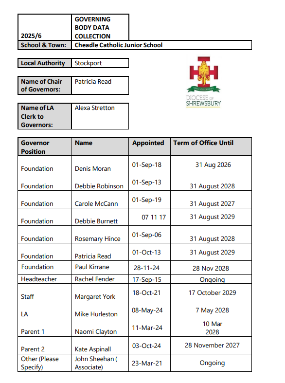 Cheadle Catholic Junior School is a Voluntary Aided school and its Governing Board consists of both appointed and elected governors.
